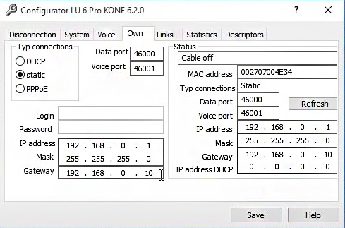 В собственных параметрах вводим ключ доступа к лифтовому блоку. Необходимо проверить соответствие идентификатора и MAC адреса, которые указаны на нижней крышке устройства. В параметрах лифтового блока мы должны ввести IP адрес лифтового блока в соответствии со схемой 192.168.0.1, а также dataport. Через него оборудование передает данные через компьютер. А через голосовой порт лифтовой блок передает и принимает голос от компьютера. По умолчанию — это 46000 и 46001 соответственно. Состояние кабеля — написано «Cable off», потому что кабель отключён. Сохраняем параметры. Изменяем параметры сетевой карты компьютера в соответствии со схемой.